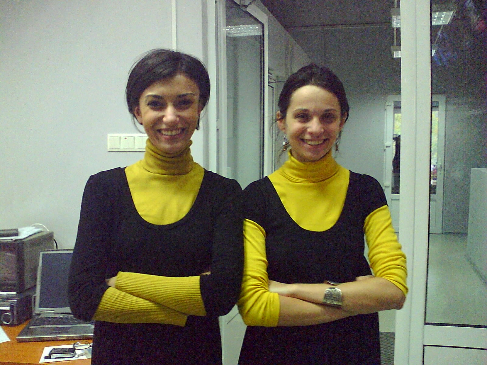 @mada – pai ne-am vazut pe dupa-masa/seara. Ea a observat. Si mi-a facut semn. Si atunci mi-am dat seama de ce mi se parea mie ca e ceva prea familiar la ea. Ca de vazut, ne vedem des, dar de data asta a fost altceva. Apoi ne-am reunit sa vorbim si in 5 minute zvonul se dusese prin redactie cu viteza luminii si de peste tot auzeam “voi v-ati imbracat la fel!!”.:))